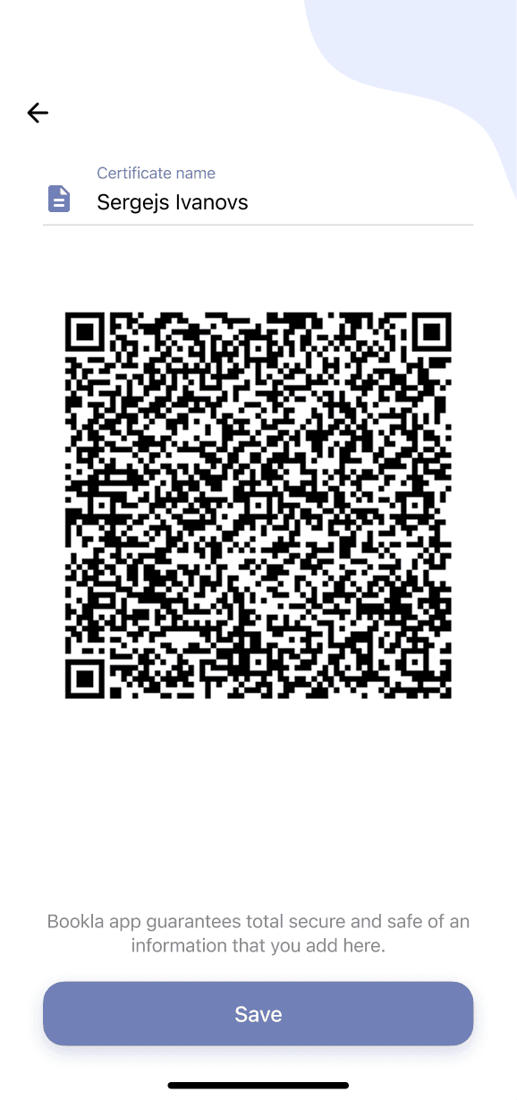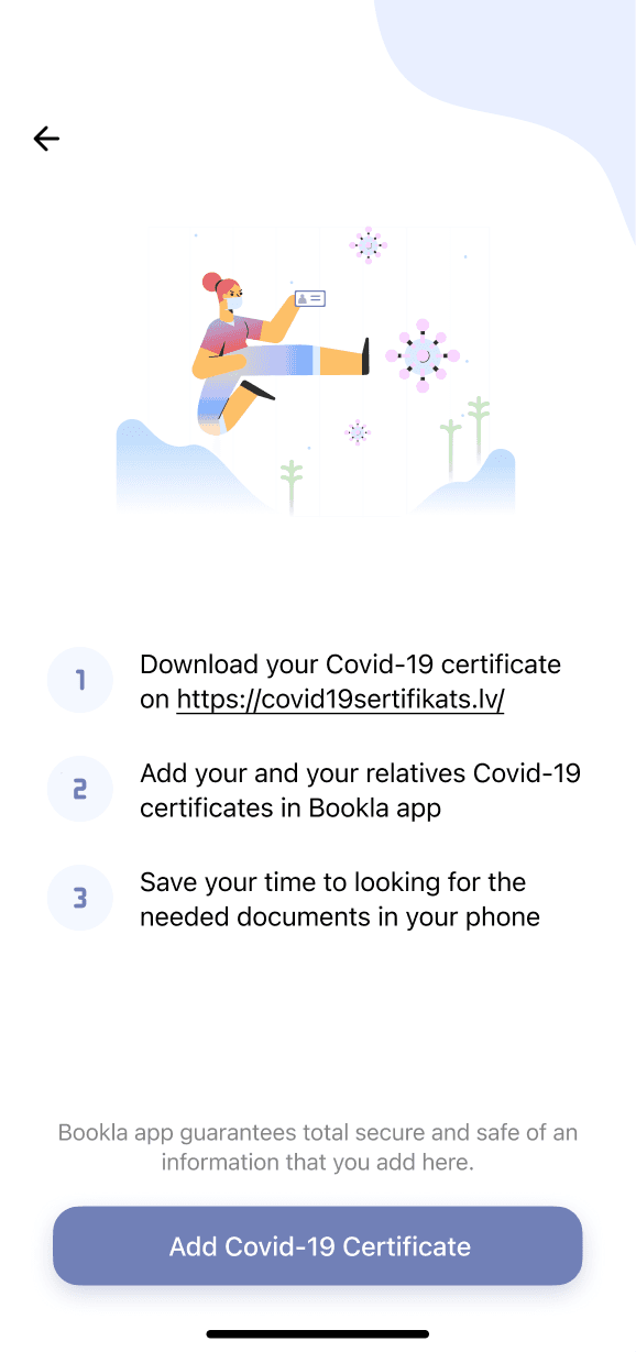 Implement a COVID-19 certificate storage feature in the Bookla app, allowing users to save and present their proof of vaccination for quick check-ins.